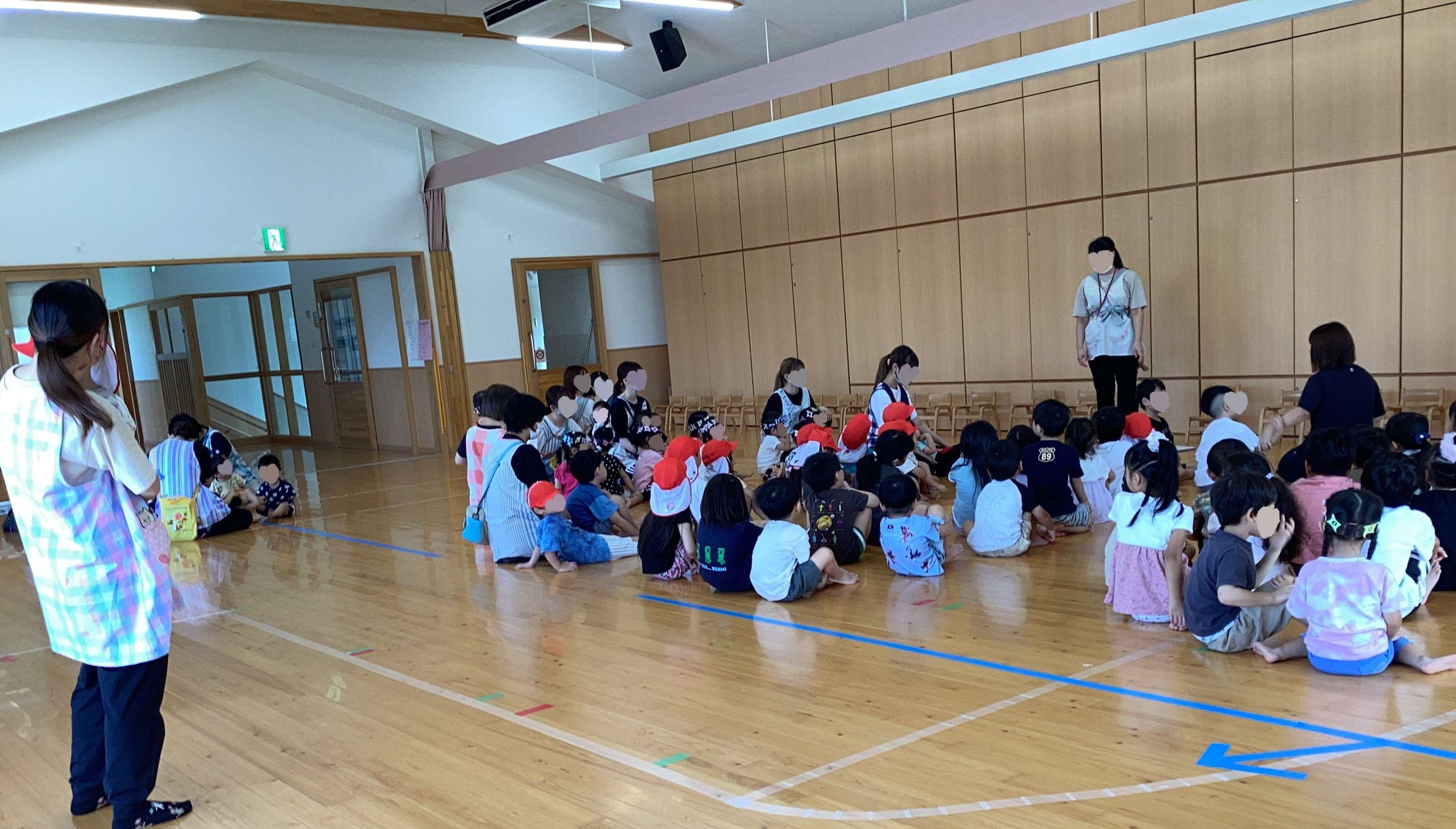 避難訓練後、運動会の見せ合いっこをしました。開会式から始まり、2歳児の競技、3歳児の競技を行いました。