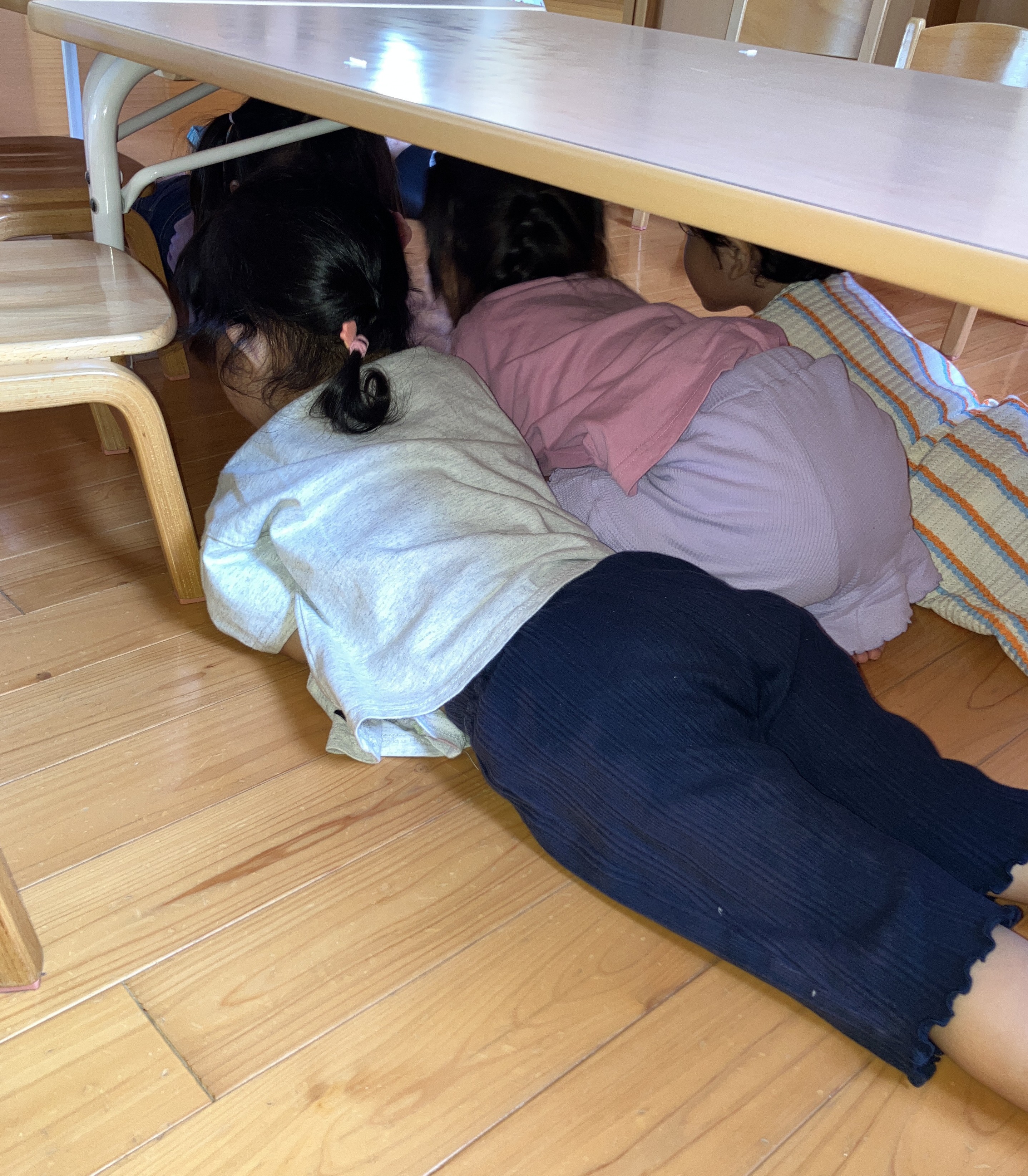 今日は、地震の避難訓練がありました。子どもたちは放送を聞くと、静かに机の下に避難しました。